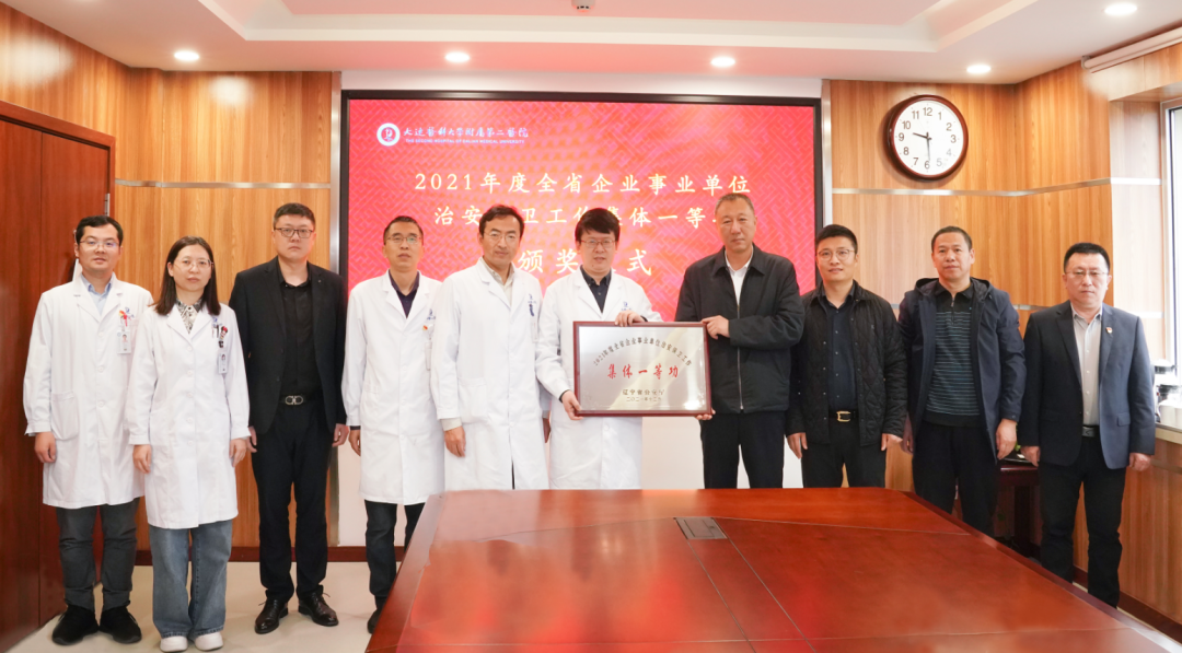 刘志宇院长对贾晓峰支队长一行的到来表示热烈欢迎及由衷感谢,同时介绍了医院的历史和发展现状,在2021年度全国三级公立医院绩效考核中,医院位列全国百强,连续多年位居A+序列,连续三年位居辽南地区首位。他表示,安全工作是高质量发展的基石,医院始终高度重视“平安医院”建设工作,此次荣获一等功,是对医院治安保卫工作的充分肯定,也是对医院疫情防控工作的高度认可,他表示,医院将以更高的标准严格做好医院治安保卫工作,积极配合公安系统的各项工作要求,全力维护医院安全稳定,为患者打造安全就医的良好环境。