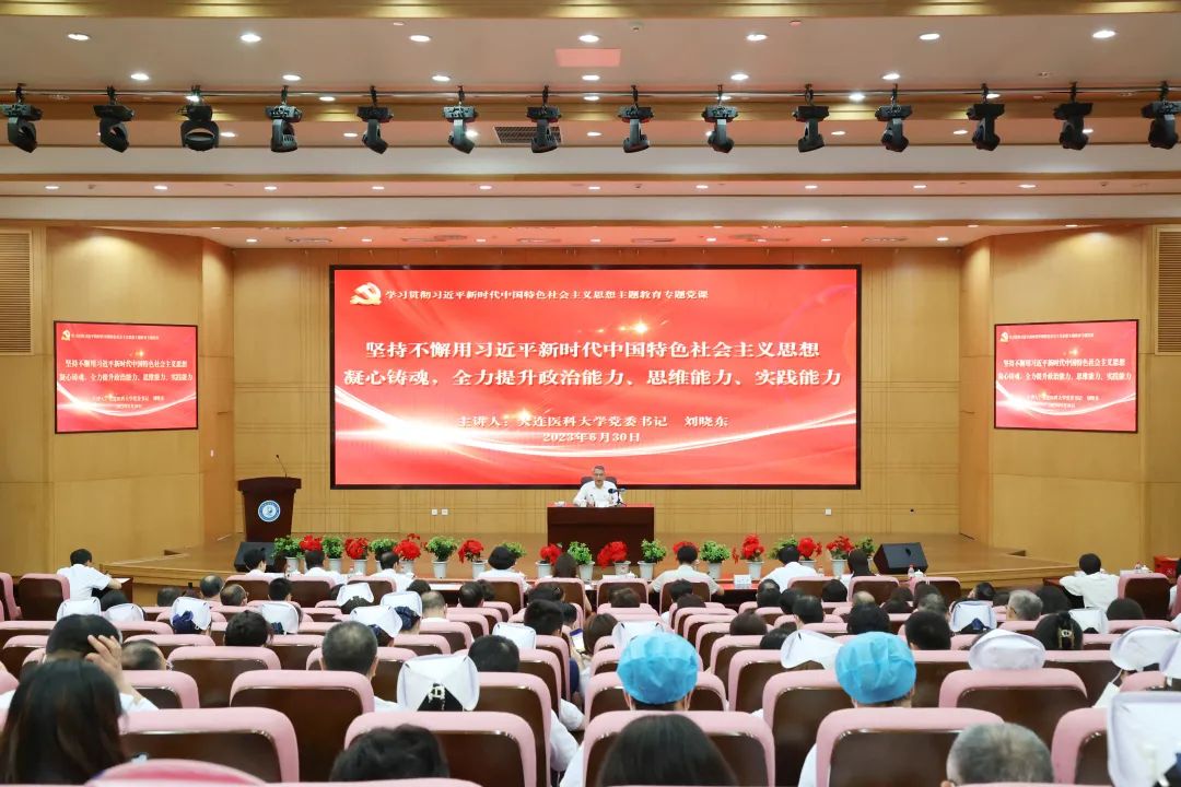 为深入推进学习贯彻习近平新时代中国特色社会主义思想主题教育,6月30日下午,大连医科大学党委书记刘晓东在我院国际会议厅为医院党员干部讲授《坚持不懈用习近平新时代中国特色社会主义思想凝心铸魂 全力提升政治能力、思维能力、实践能力》专题党课。党课由我院党委书记任萍主持。