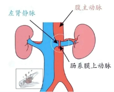 而在医学上,有一种名为“胡桃夹综合征”的疾病,是由于腹主动脉与肠系膜上动脉之间的夹角过小,穿行在这个夹角中的左肾静脉受到挤压,就像被胡桃夹子紧紧夹住的胡桃一样。由于左肾静脉长期受压,可引起左肾、输尿管及生殖腺静脉内压增高而造成精索静脉曲张,严重者还可出现肉眼血尿、蛋白尿、阴囊疼痛等症状,在儿童和青少年,特别是瘦高人群中比较常见。