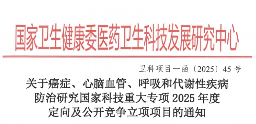 近日,国家卫生健康委医药卫生科技发展研究中心公布了关于癌症、心脑血管、呼吸和代谢性疾病(简称“四大慢病”)防治研究国家科技重大专项2025年度立项结果。