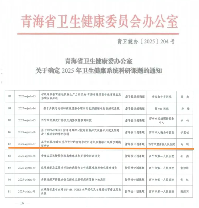 付毅医生联合我院专家团队,不仅分享大医二院在科研课题申报中的成熟经验,更注重引导当地医护人员将临床实践与科研创新深度结合,帮助其建立“临床发现问题-科研解决问题-成果反哺临床”的思维模式。经过反复打磨、多次优化,最终选取《基于回顾-前瞻双阶段设计的青海农牧区老年胆囊结石风险预测模型研究》作为申报课题,并凭借精准的研究定位、扎实的临床基础与可行的实施路径,成功通过省级评审,实现了“从0到1”的突破。